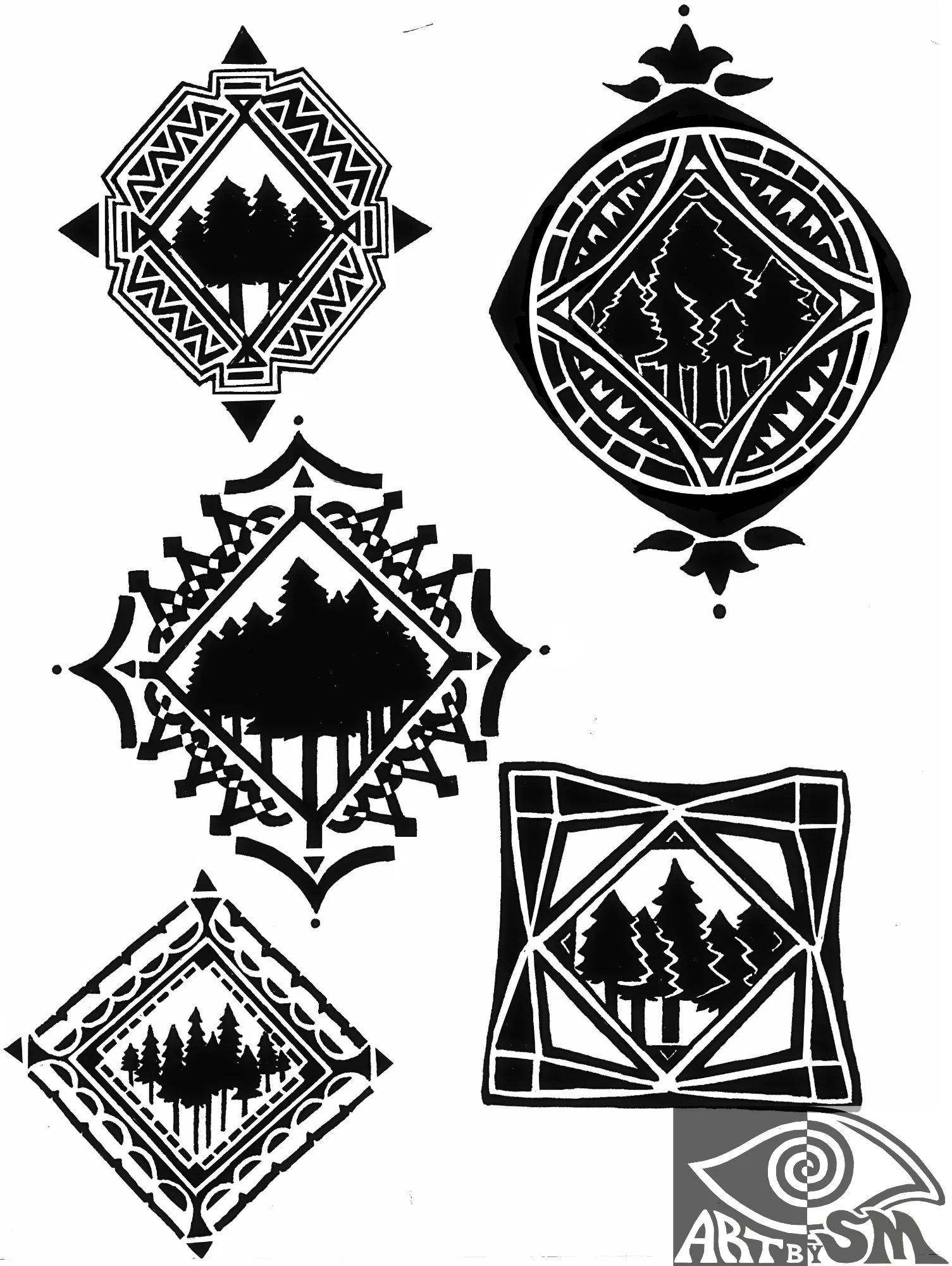 Formal/Technical Process: This piece was taken from a request from a girl watching me draw in class who wanted ideas for tattoos. She asked me to include a diamond-shape and PNW trees.