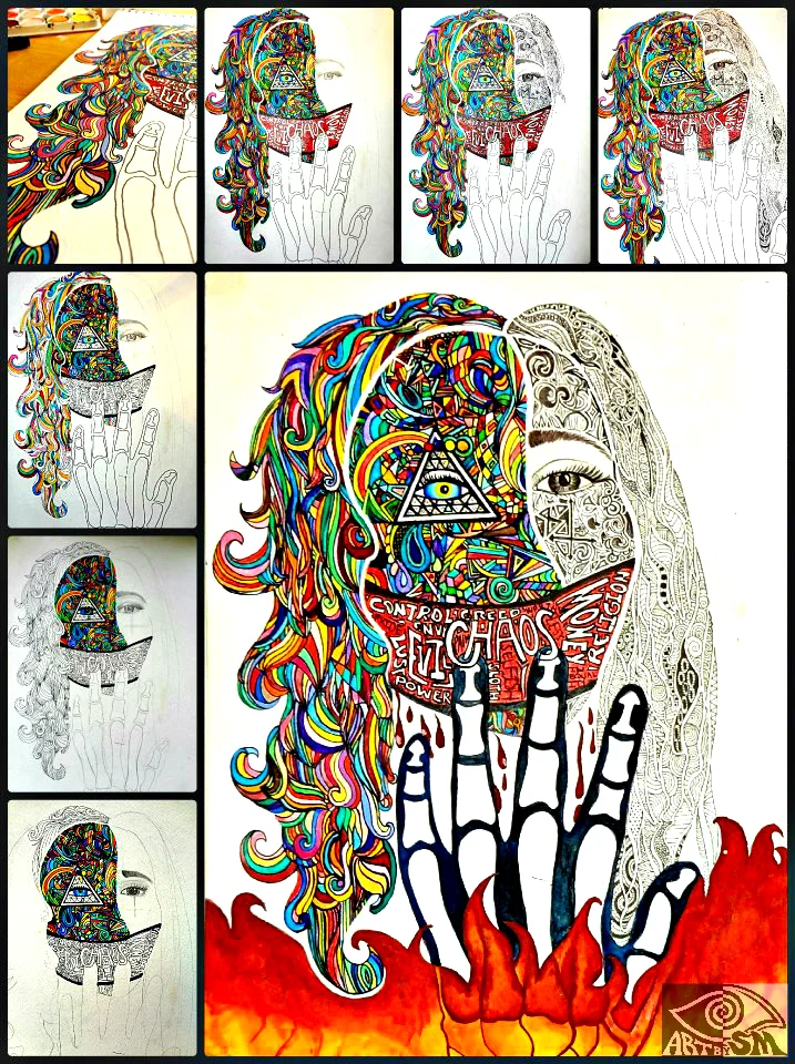 Conceptual Meaning: This piece has a deep emphasis on depression washing over my self identity. This piece was drawn during a very dark time in my life, and this was my perception of who I became during that period. I show themes of aesthetic chaos and harmony. My internal strife (black/white) bleeds through scalp into an array of colors
